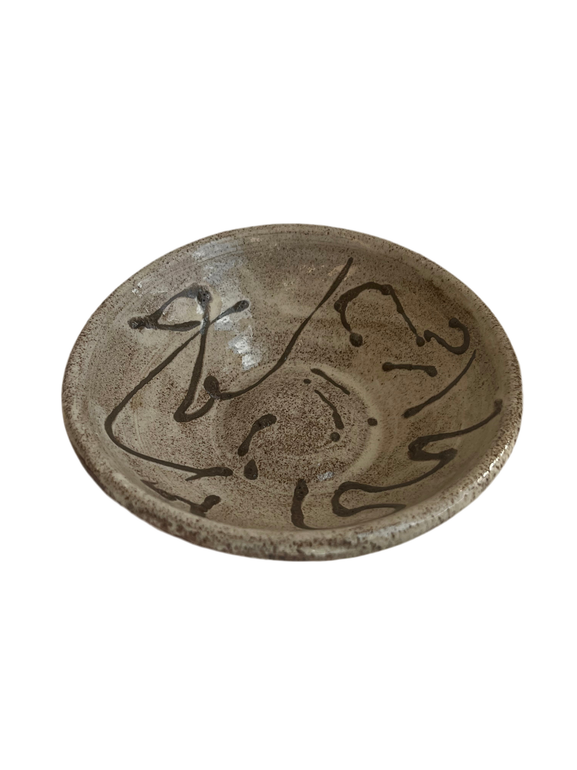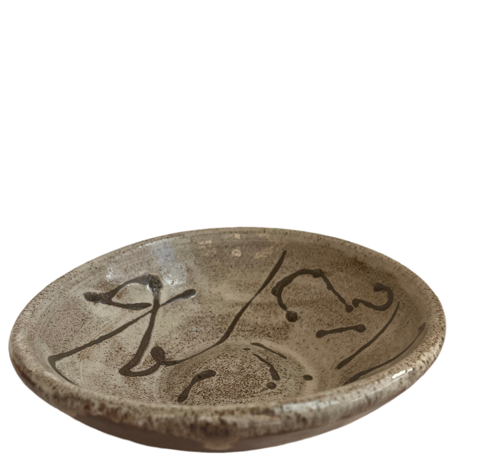 Lille flad skål til f.eks. olivenolie. Stentøjsler med glasur.